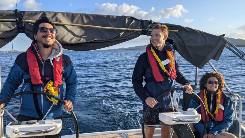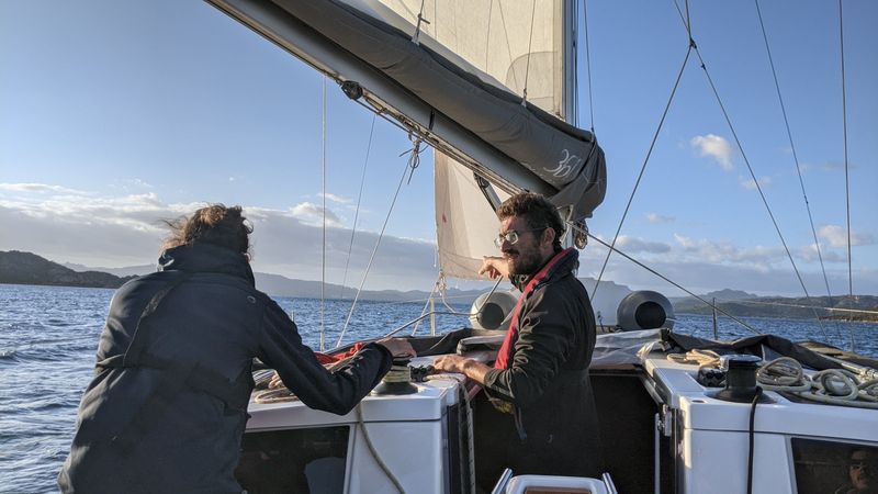 algunos bellos momentos de navegación robados a la caprichosa méteo, entre tormentas y vendavales, una noche fondeados a solas en el mundo, excursiones en las alturas de Cerdeña, una introducción al windsurf, algunos aperitivos, ¡y mucha gastronomía local!